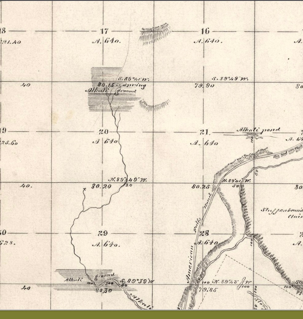 The area that the canal soured already showed strong alkaline tendencies long before the canal appeared, though. The shaded areas of the survey map above, made in 1888, show the already 'subby' areas: at what is now the Sterling townsite, south of the center of the labeled section 29, and three other areas north toward what is now State Highway 39.