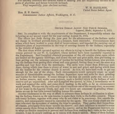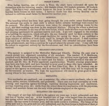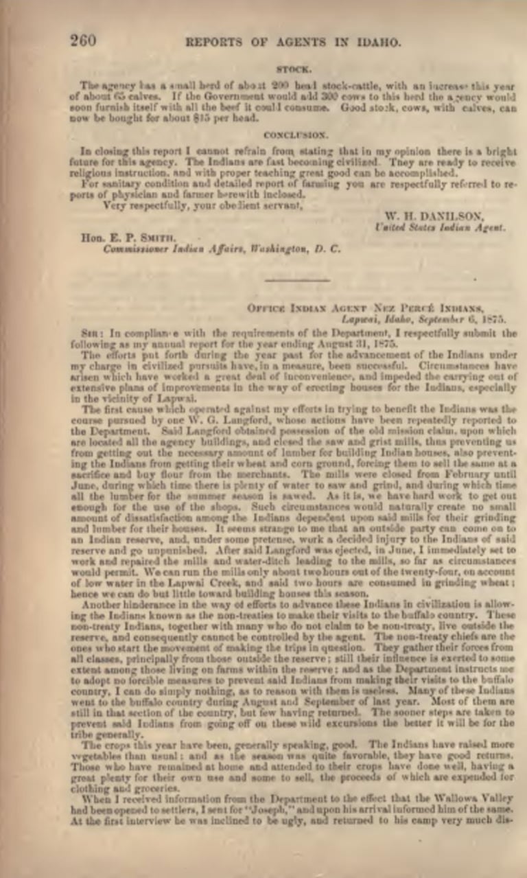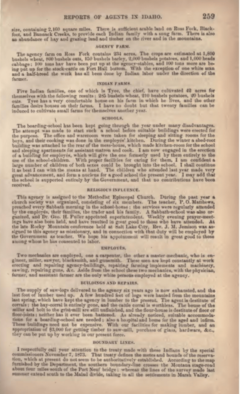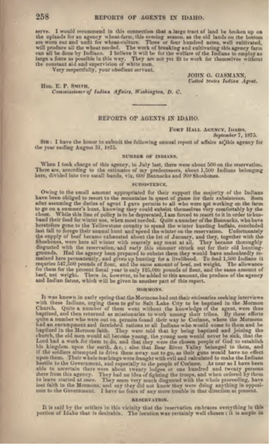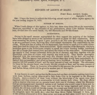 Major Danilson's (the spring running through Springfield bears his name) report for the U.S. Government regarding the Fort Hall Reservation (from The Report of the Commission of Indian Affairs for 1875). Note the paragraph on Mormons converting the natives: