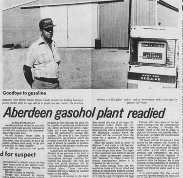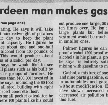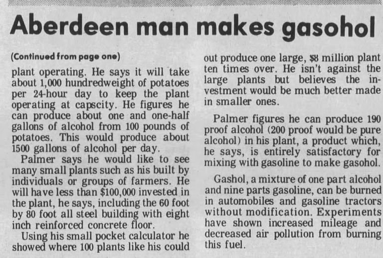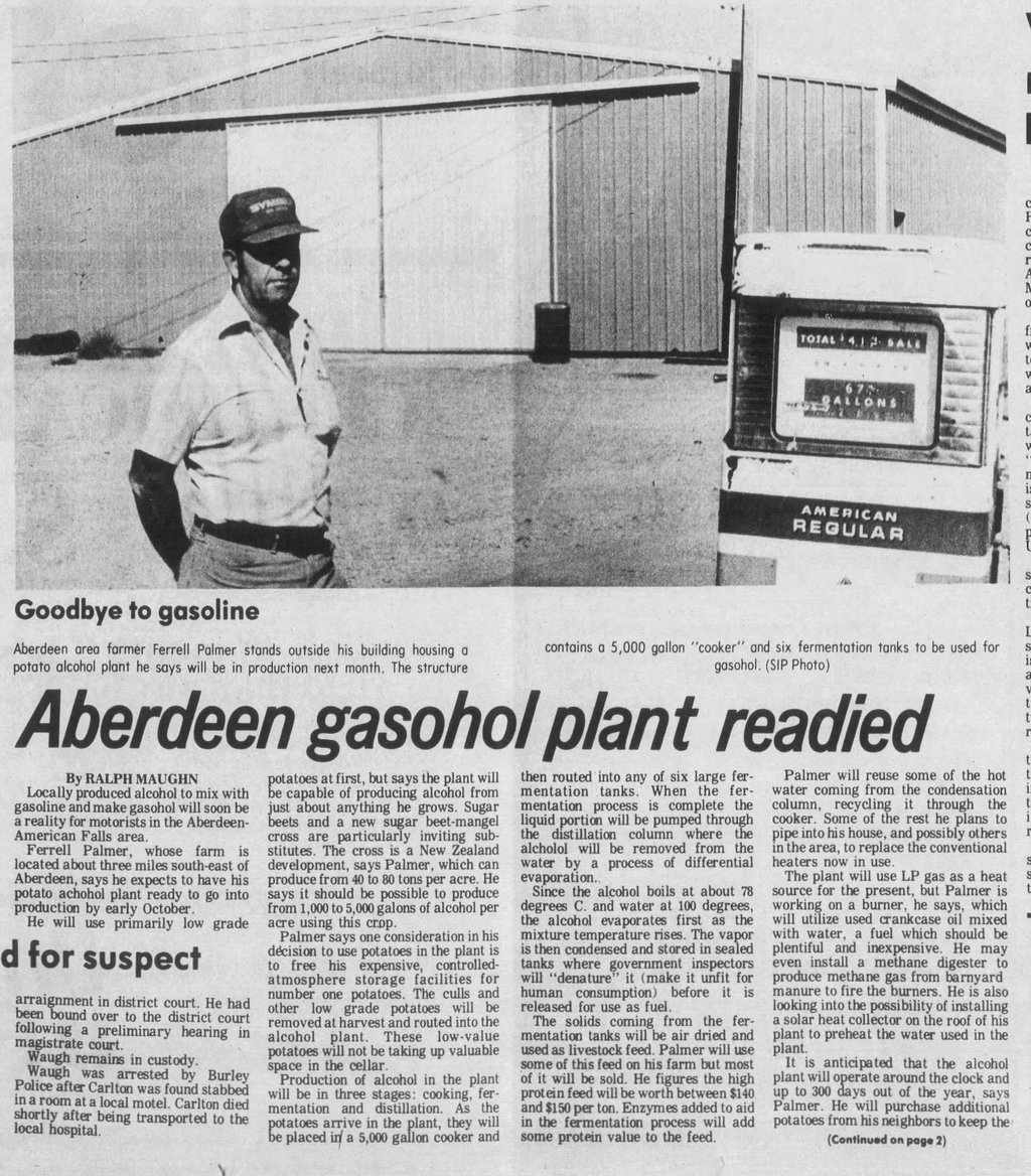 A study was undertaken at Raft River in the hopes of using geothermal energy for an alcohol plant and four gasohol sites in Wyoming were vying for a plant, even as an Aberdeen farmer already had production facilities underway. Ferrell Palmer intended to use a thousand sacks of low-grade potatoes a day to make 1500 gallons of alcohol.