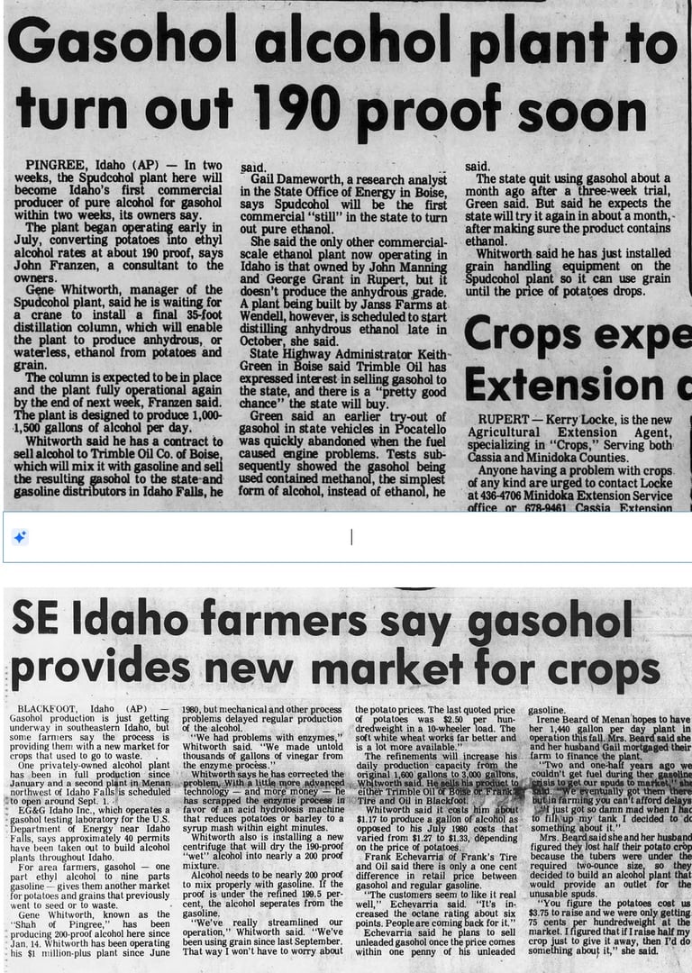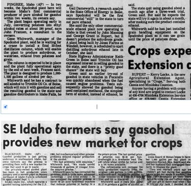 For a few years in the late 1970s and early 80s, Bingham County farmers (and more widely, Idaho and American farmers in general) thought they might capitalize on a new market for their products. Uncertain oil supply from the Middle East, due to political upheavals, threatened the country's security. Government officials looked to agriculture as a possible source to replace expensive imported fuel. Fresh off a potato diversion year when millions of sacks of spuds had to be fed to cattle, farmers were eager to find an additional market for their goods and jumped at the chance to make alcohol, ethanol, gasohol and even "spudcohol"--as the self-proclaimed "Shah of Pingree" dubbed his product.