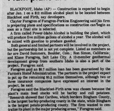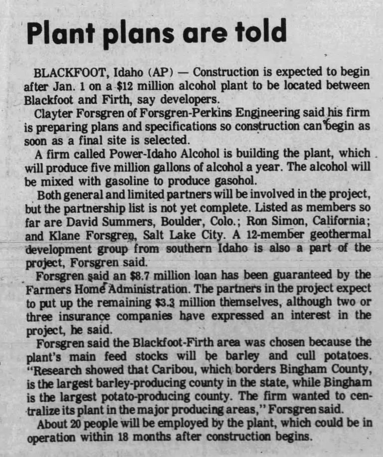 Forty permits for plants were pending in Idaho in 1981. A Burley plant was okayed and a large production facility, operated by Power-Idaho Alcohol, was expected to start construction on January 1, 1981 between Blackfoot and Firth. It would utilize cull potatoes and barley.