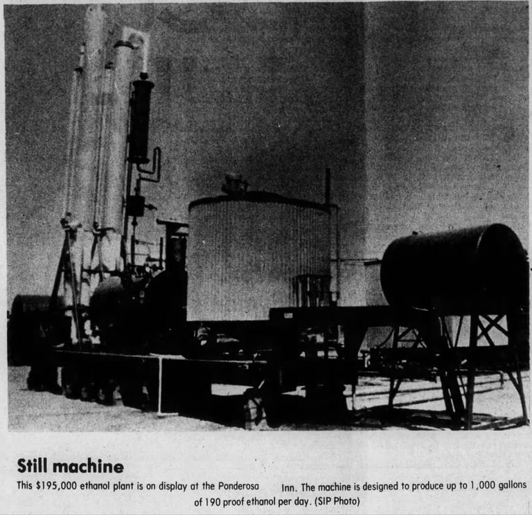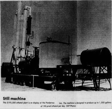 More businessmen and farmers showed interest. Rupert, Idaho. Kimberly, Idaho. Garland, Utah. The prospective facilities proliferated. Manufacturers displayed a prototype plant costing $195,000 at the Ponderosa Inn in Burley, hoping to gain farmers' interest in alcohol production.