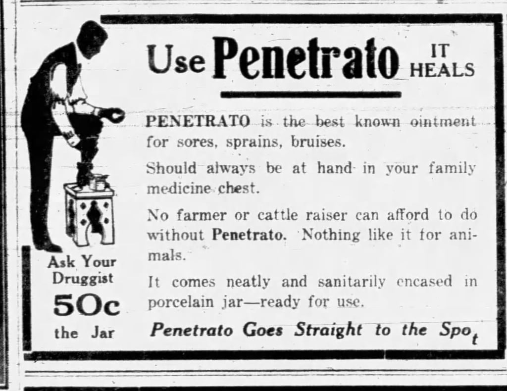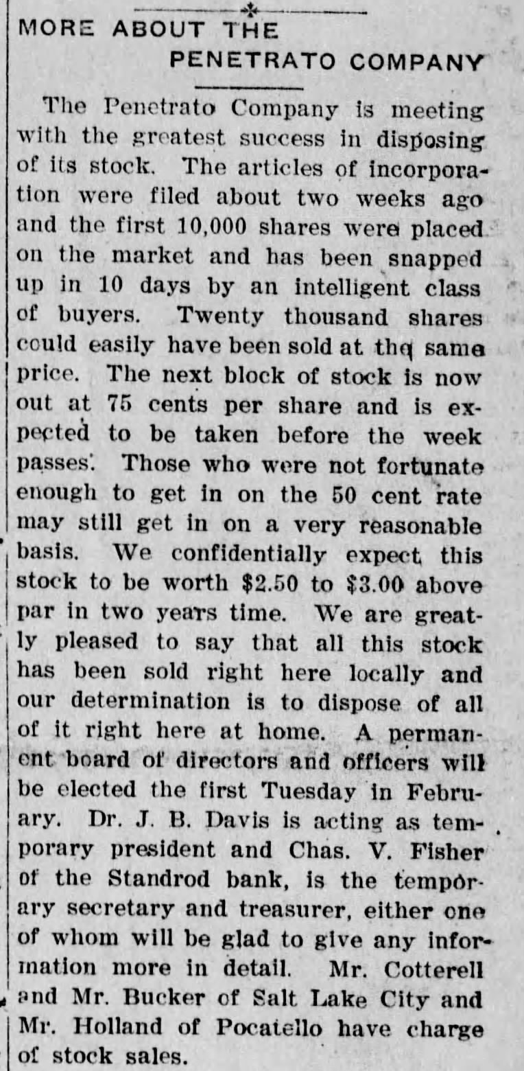 Bingham County had its share of idea men, including those who started the Penetrato Company--Hans Peterson, Riverside store owner, was on the board of directors.