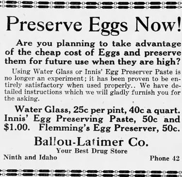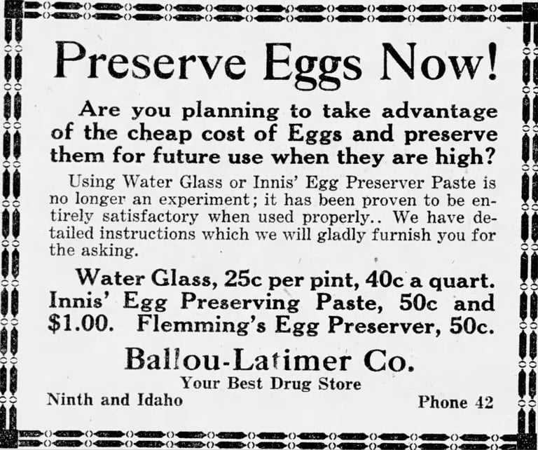 In 1916, another Bingham County invention appeared: an egg preserving lacquer, useful in those days when refrigeration was possible but far less common than it is today.