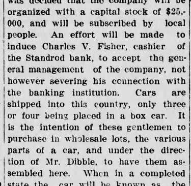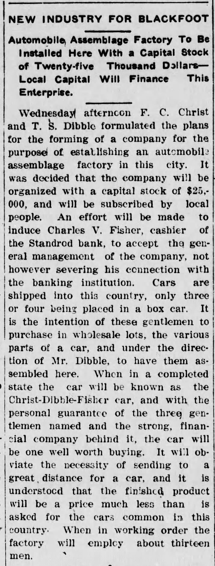 Some Blackfoot men in 1913 truly could claim to be ahead of their time, seeing the advantage to shipping automobile parts in from far away places and assembling the cars locally, rather than bringing them in as fully complete vehicles. Farm equipment would be shipped this way in the coming decades, and by the late twentieth century the practice was common for foreign autos, as well--though Blackfoot's endeavor didn't get very far.