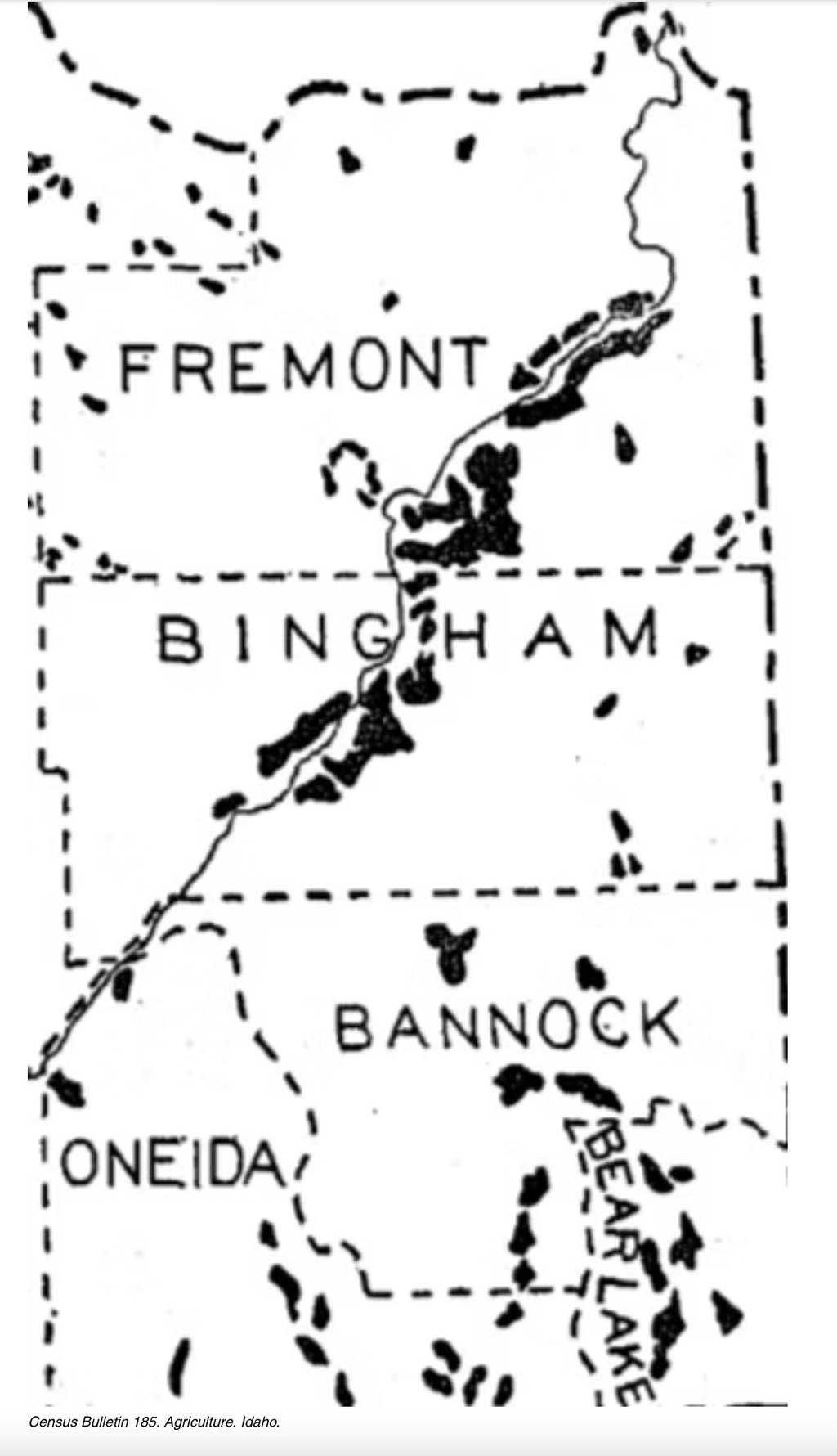 Bingham County had 1160 farms in 1900 totaling 196,000 acres, though only 101,000 of those acres were "improved", i.e. farmed and likely irrigated. The county's farmers grossed $838,000 in income (multiply by forty to get a rough equivalent of its worth today) and their fertilizer expenditure, combined, was a whopping $1300—commercial fertilizer application was a long way off in the future.