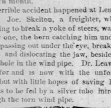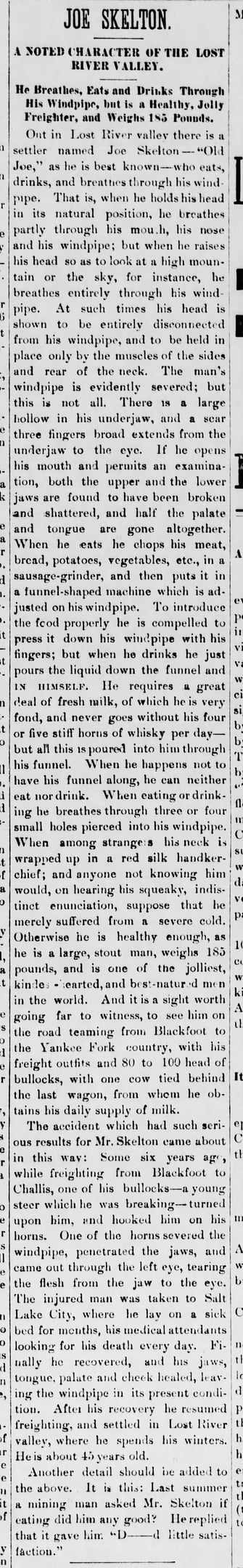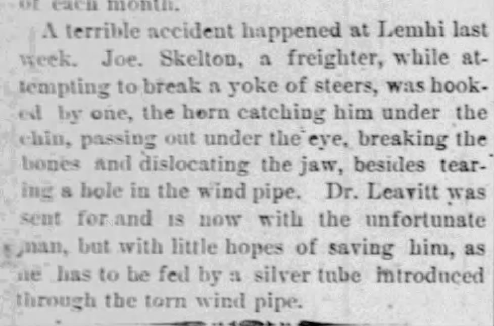 A Bingham County resident in the 1870s may have been acquainted with a freighter named Joe Skelton. If so, their meeting was likely memorable, as he was considerably disfigured due to an encounter with an ox in 1874. The ox, a barely broken member of one of his teams, caught him in the throat with a horn that severed his windpipe, went through his jaw and tore his face clear to his eye.