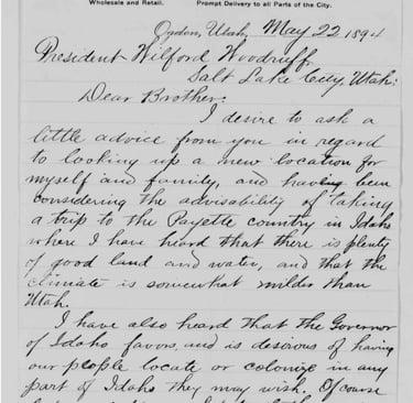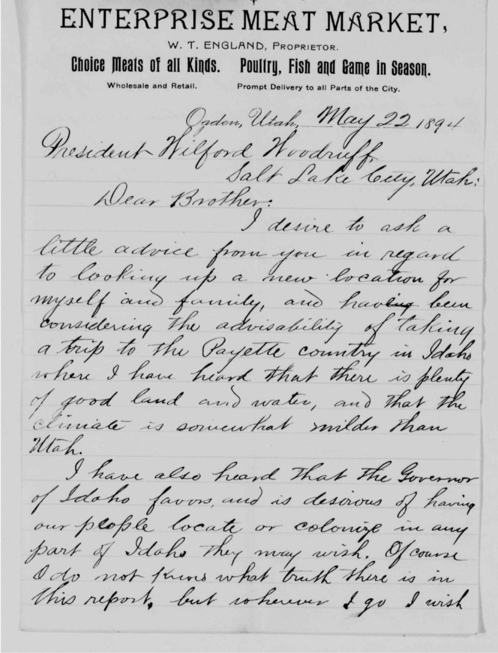 One of the main men involved in the building of the Peoples Canal, John England, was looking for a place elsewhere in Idaho months before he laid the first furrow of the Bingham County canal but months after the American Falls Canal had already filed their water and land claim. Here's a copy of the letter: