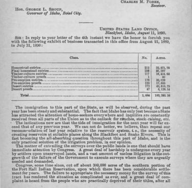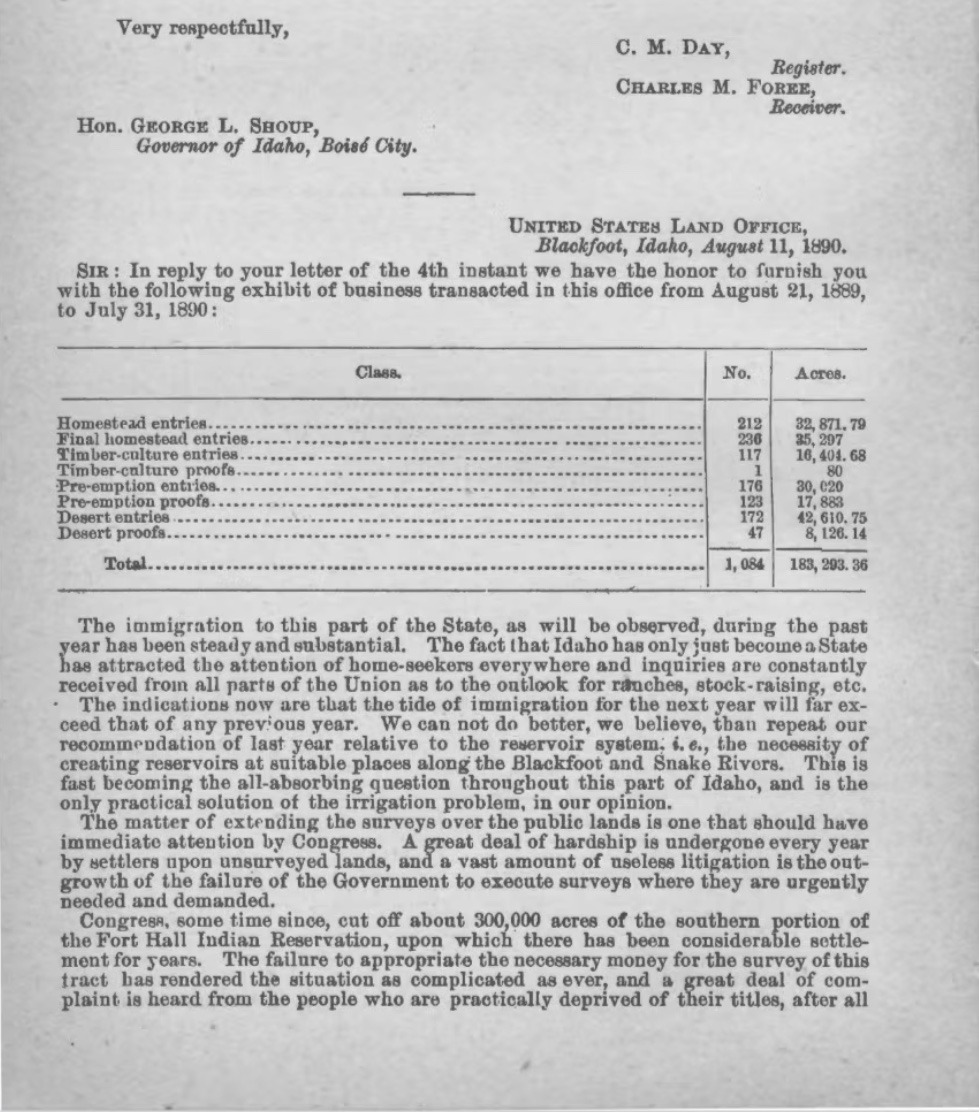There were many avenues toward land ownership in Bingham County in 1890. The Land Register from Blackfoot listed the year's claimants in the Governor's Report as 212 Homestead Entries, 117 Timber Culture Entries, 176 Preemption Entries, and 172 Desert Land Entries.