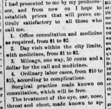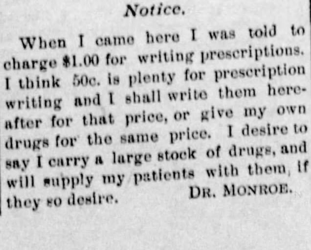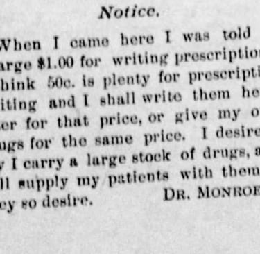 Pharmacists, almosts wholly unregulated, dished out laudanum (an opiate) and often sold alcohol as medicine--even during pre-Prohibition days, when the County had outlawed alcohol at bars, you could often procure it at the druggist's establishment. Doctor Monroe kept a large supply of drugs at his office, and published his charges--fifty cents a prescription: