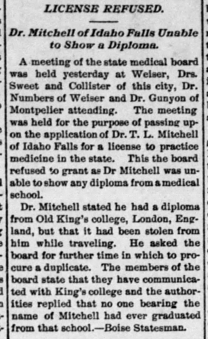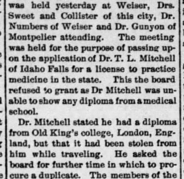 Apparently a doctor's credentials might be suspect. Dr. Mitchell, an Idaho Falls doctor who later would practice at Blackfoot and be the center of a trial regarding a botched abortion, had his license denied--the board found he had no diploma.