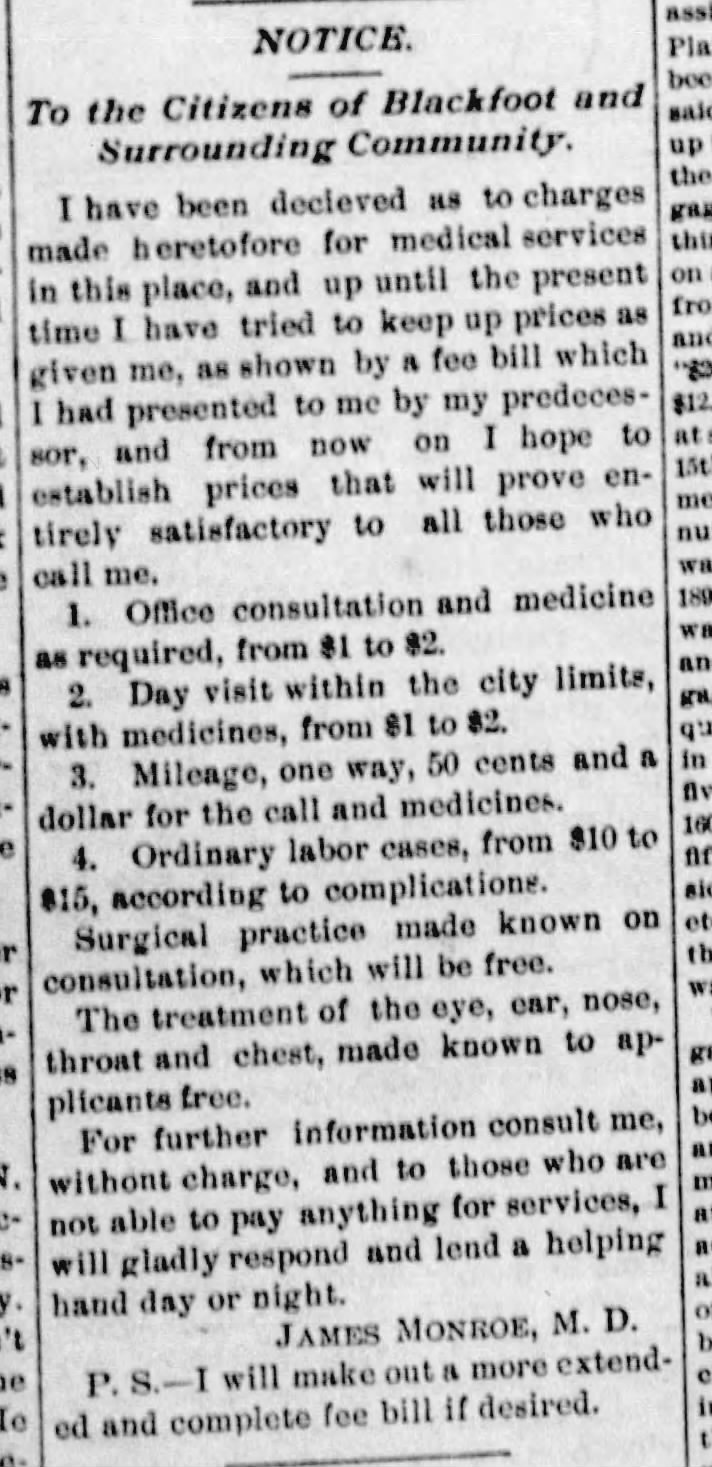 Optometrists, as well as dentists, often came as itinerants, stopping for three or four days in a hotel room in Blackfoot and then moving on. Regular doctors moved with less frequency, with the County keeping one on salary for decades. If you complain about the cost of today's doctor visit, you might take a copy of this price schedule to show your physician--maybe you'll get a better deal if you ask him or her to match the charge (particularly if you're pregnant, the delivery charge then being $10):