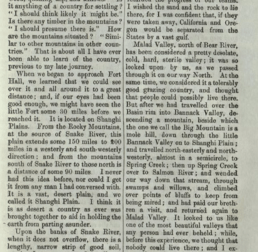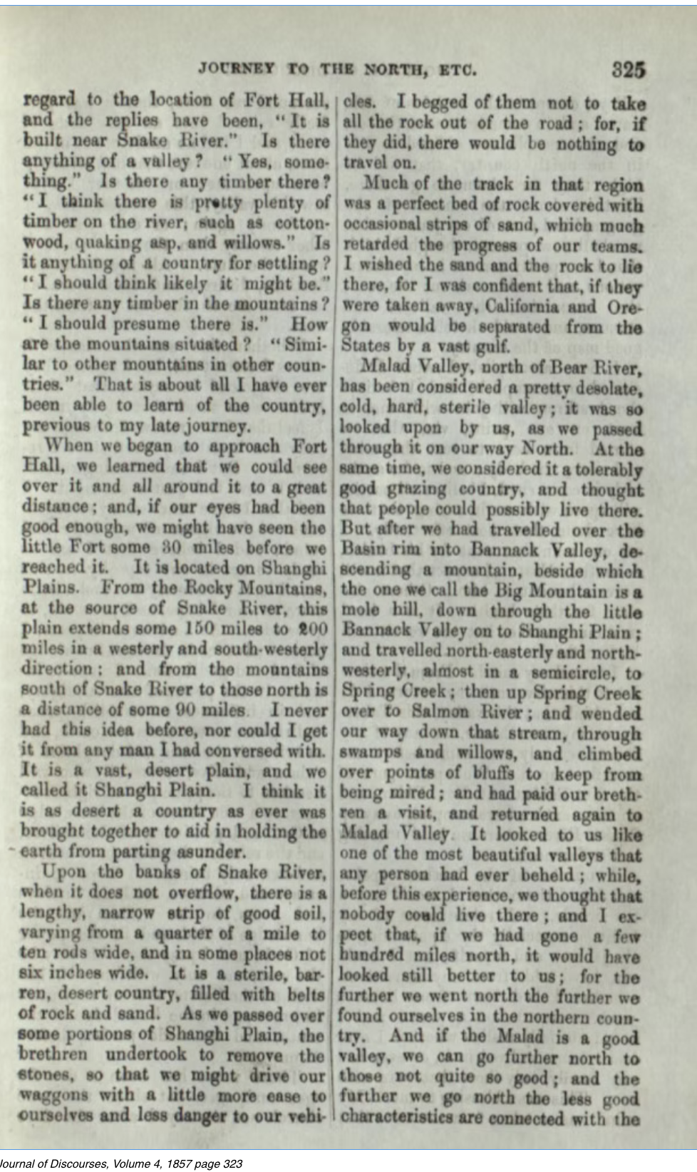 In 1857 Heber Kimball, a member of the original LDS Quorum of Apostles, described the Shanghi Plain (what we now call the Snake River Plain) as extending 150-200 miles westward from the north-south flowing part of the Snake in what is now Eastern Idaho, and reaching 90 miles from its bordering southern hills to the mountains of the north which complete the rim of the somewhat oblong basin. The Mormon parties that trailed from Utah to the unsuccessful outpost at Fort Limhi in the 1850s skirted the Shanghi Plain by first going north along the west side of the Snake and then turning through the Mud Lake area at the northern edge of the basin--cattlemen and sheepmen would likewise later choose this route, for the most part, to move their stock from one range to another or to market. Kimball emphasized its rocky nature and called it a sterile, barren area, one possessing mostly belts of rock and sand. He wrote it was "as desert a country as ever was brought together".