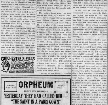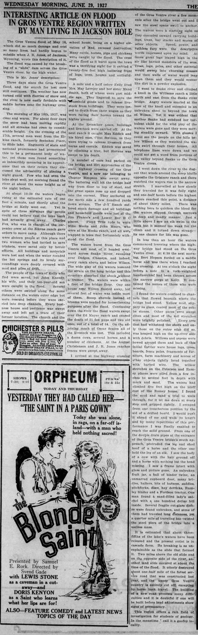 The winter of 1927 had seen heavy snowpack, and subsequent rain on the snow in May made the dam overflow. As the Gros Ventre flooded, Ranger Dibble saw what was coming and so drove to town to warn residents. They had just fifteen minutes to get out of the way of the waters. By four PM, just six hours after the damburst when the waters receded, a half million dollars in damage had occurred, leaving six dead. Of lesser importance, the now ruined town of Kelly was not awarded the county seat--it was given to Jackson.