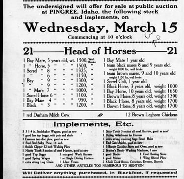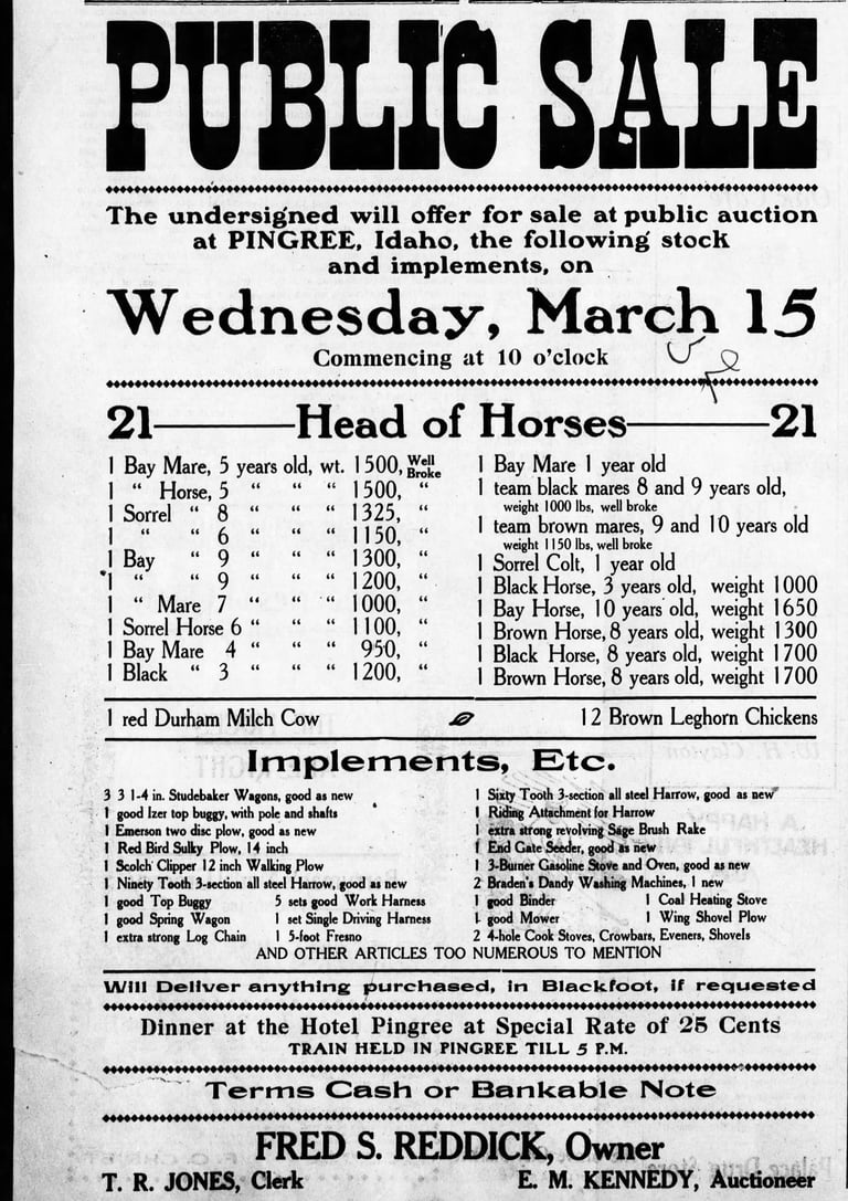 O.B. was instrumental in Pingree's development, petitioning for a Post Office—gathering 44 signatures in thirty minutes—in 1909. He became president of the Pingree Commercial Club at that time. Fred moved into the townsite and sold his belongings from his land at Rich, which included 35 hives of bees and 21 horses, at a Pingree auction, where a meal at the Pingree Hotel was being served for attendees for twenty five cents. The Pingree train would be held until 5 PM, attendees were told, to make sure prospective purchasers could get home to Blackfoot. Fred went back to Pleasanton, Kansas shortly afterward.