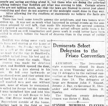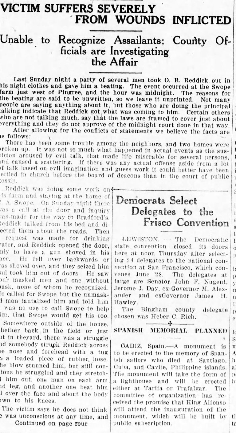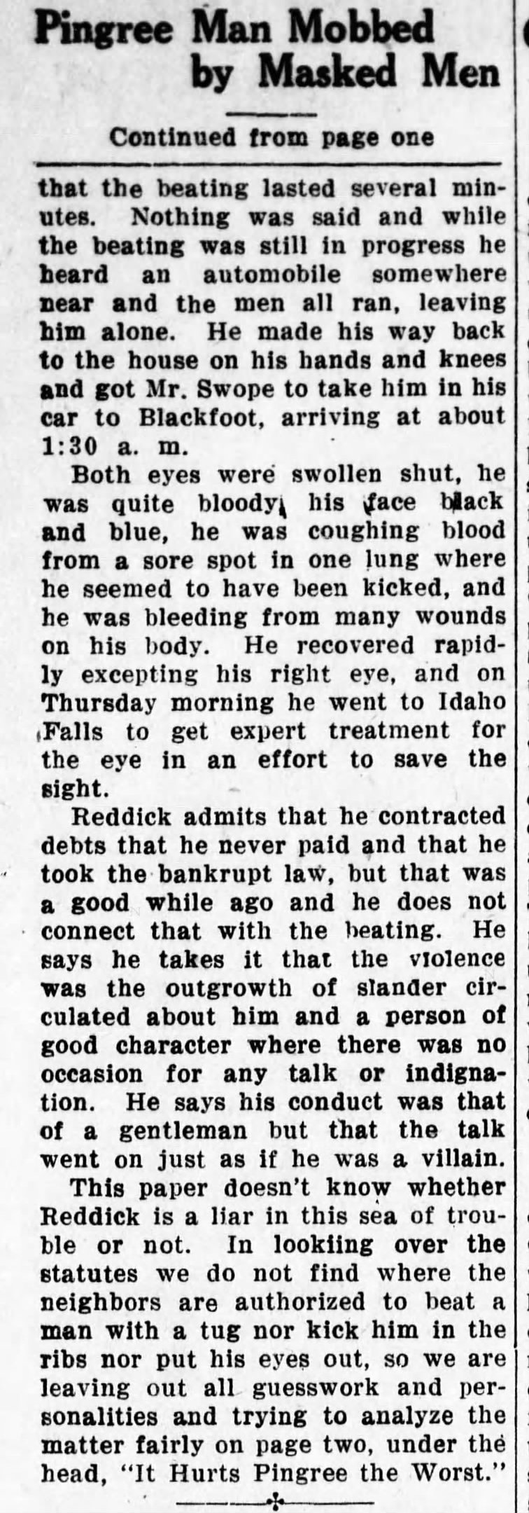 Reddick had a considerable homestead of 160 acres south of Pingree at the time and was staying at fellow Kansan C.A. Swopes', the former Pingree store owner, who was proving up on a plot of land just west of the village. On a Sunday night Reddick was awakened at midnight by men asking where a neighbor's property was and from his bed he shouted to them the directions. They then asked for drinking water and when he answered the door he was met with a gun in his face. By his account five men, four of them masked, dragged him outside and beat him on the body, limbs and face for several minutes. Other reports said there were as many as 35 men involved. An automobile driven by Swopes came and the men ran. Swopes then took Reddick to the hospital. His eyes were swollen shut, he was coughing blood, and he had numerous cuts and contusions. He went to Idaho Falls to a specialist the next day, hoping to save his right eye.