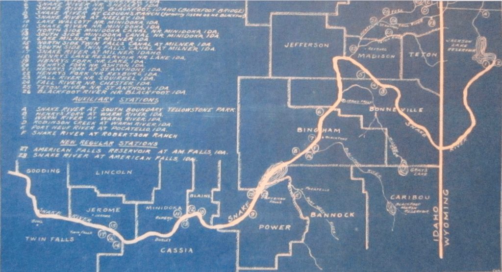 With a team of observers and hydrographers in place, data collection became possible so that the irrigators' aim of zero water wastage might be approached. Readings at the many stations revealed water loss percentages at different areas on the Snake--6% between Woodville and Blackfoot, for instance, and lesser losses of 2% or less upstream. The gages showed net gains between Blackfoot and Neeley, near Massacre Rocks below American Falls, the water coming from Reservation streams and thos in the Springfield-Sterling area adding roughly 2500 second feet to the river flow.