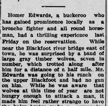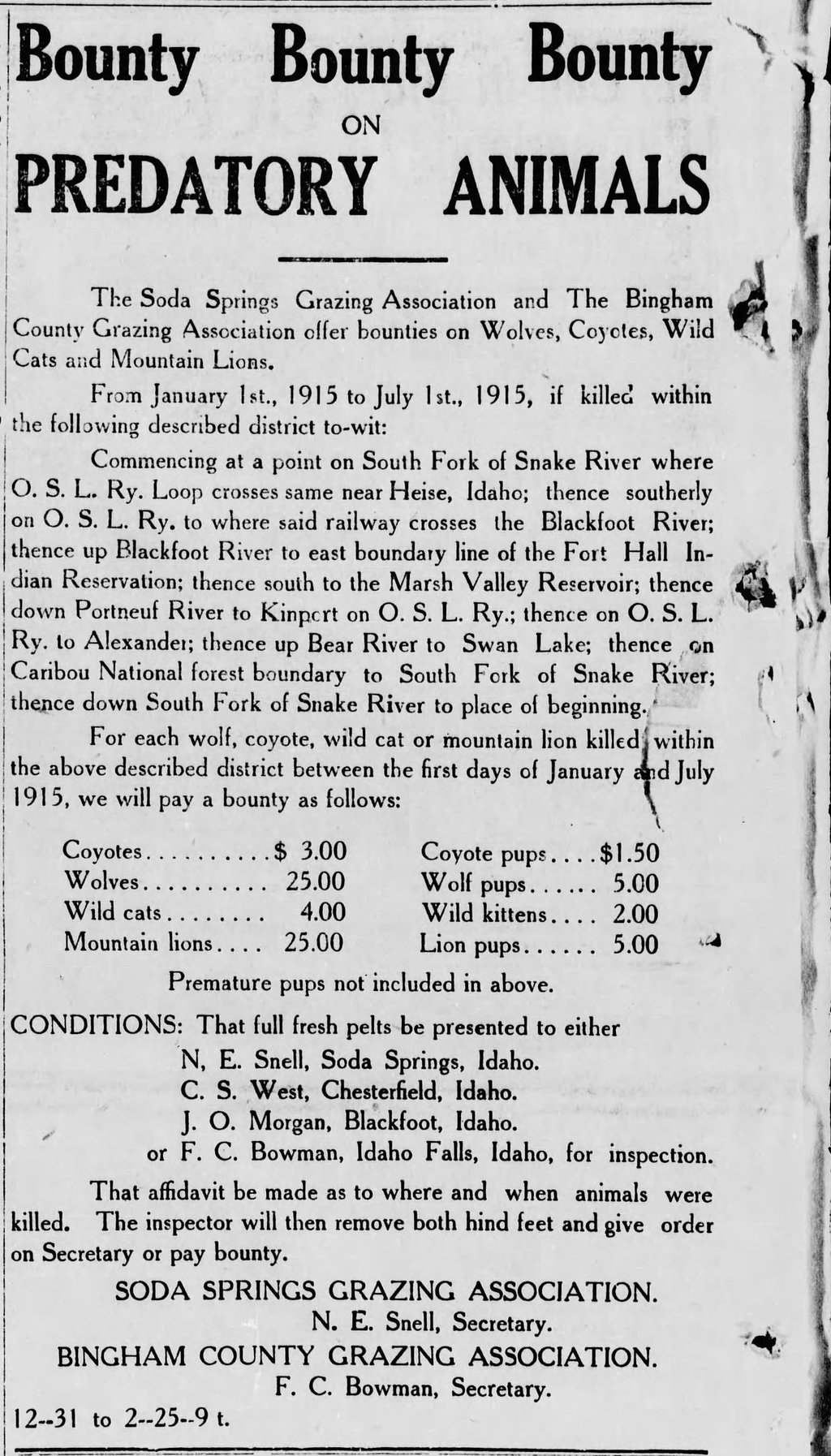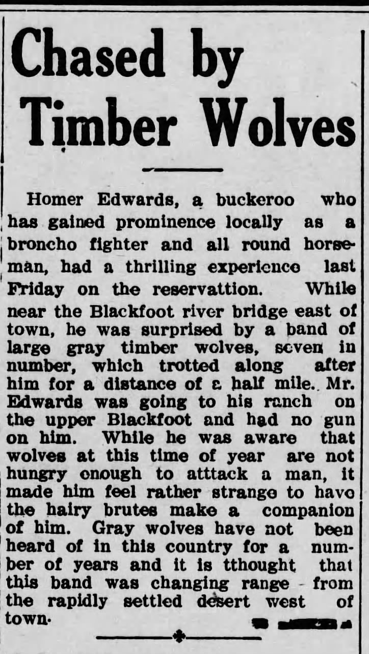 The Bingham County Grazers had organized a wolf hunt, equipped with a pack of dogs, in November of 1913. The wolves were growing so bold as to attack full grown horses and cattle, with large losses of Willow Creek cattle. The grazers reported paying out for 17 wolf kills, as well as for 934 coyotes and 75 bobcats taken in a stretch of land from Idaho Falls to Soda Springs. One rancher near Blackfoot was near the Blackfoot River bridge east of town when seven gray wolves began accompanying him, not necessarily giving him a scare but causing concern since he was carrying no firearm, making him feel "rather strange".