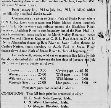 A Fremont County legislative representative had proposed a tax on sheep in 1899, one and a half cents a head plus a small assessment on all real and personal property to provide a bounty fund for the killing of bears, wolves, lynx, bobcats and coyotes. The Bingham County bounty tax in 1895 went to rabbits--two and a half cents apiece was paid out upon receipt of the rabbits' ears as proof. The Sheriff was "cremating" 12,000 ears in April 1897, just before the bounty was annulled, presumably because of the great cost. The county assessment for predator control would equal the outlay for the road department in 1917, one cent per $100 of property valuation.