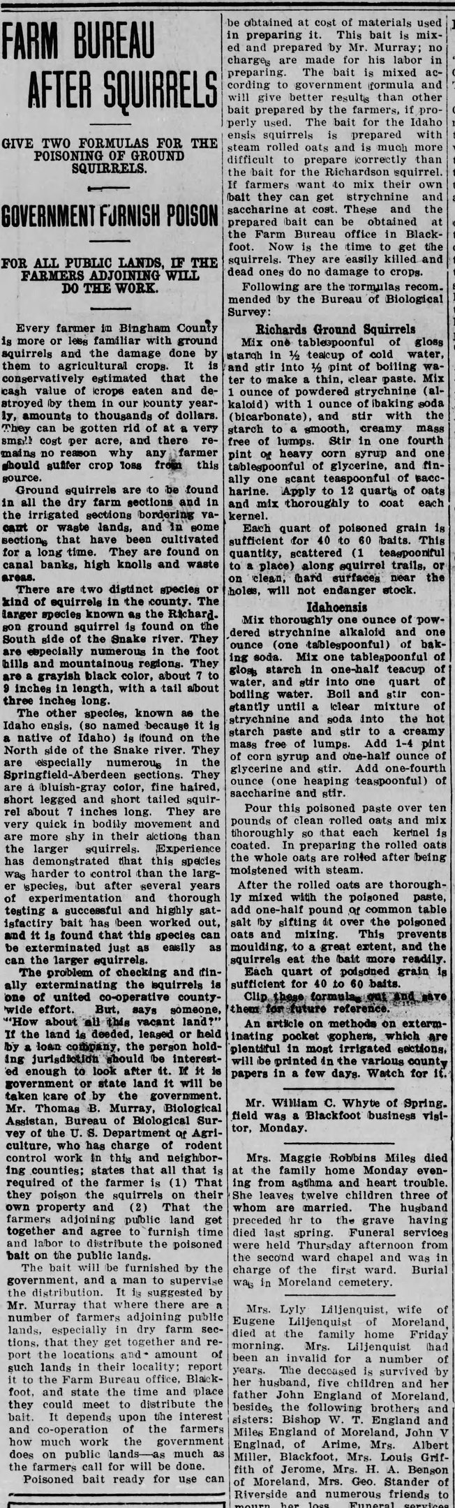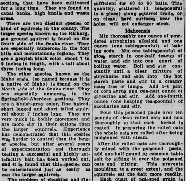BIngham County officials told residents that two species of ground squirrels plagued the county, the Richardson ground squirrel south of the river in the foothills and mountainous regions and the Idahoensis north of the Snake. The Richardson was 7-9 inches long and grayish black with a three inch tail, the ensis bluish gray and smaller with a shorter tail. The two species required different concoctions in order to kill them: