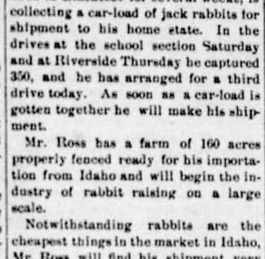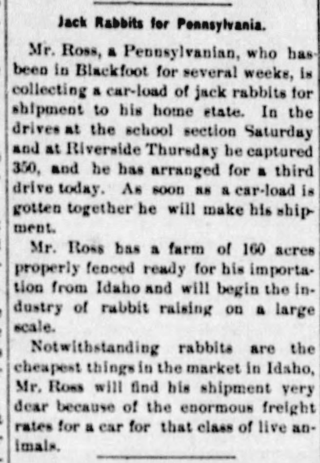 One local man, trying to make lemonade out of the rabbit lemon in 1899, collected a train car load of live jackrabbits to his hometown state of Pennsylvania, hoping to capitalize on them as a meat product.