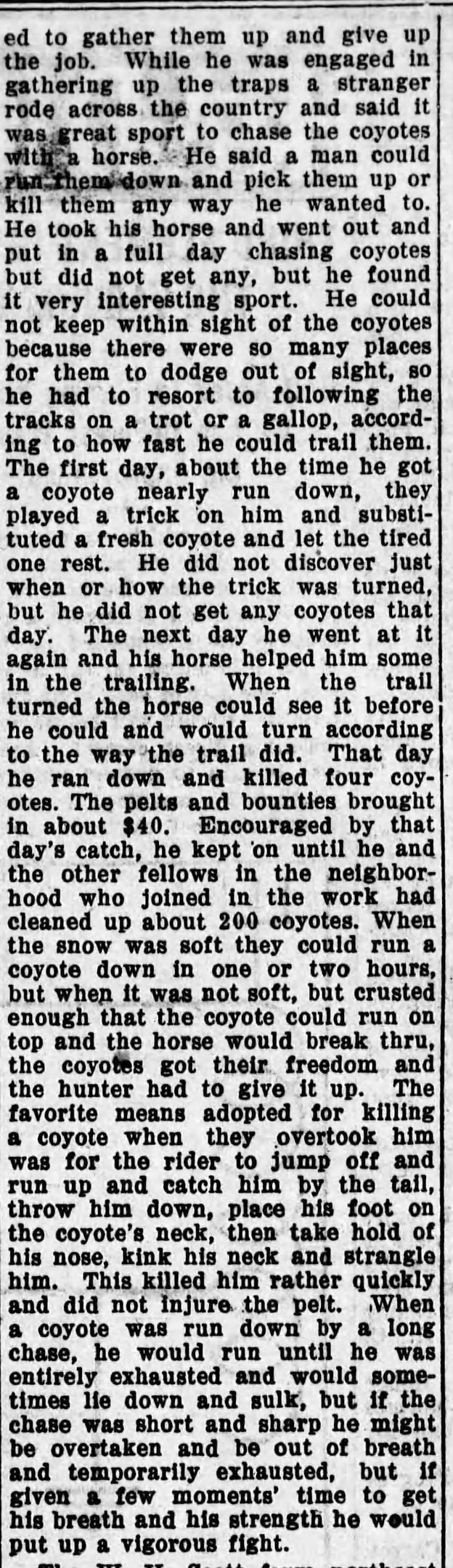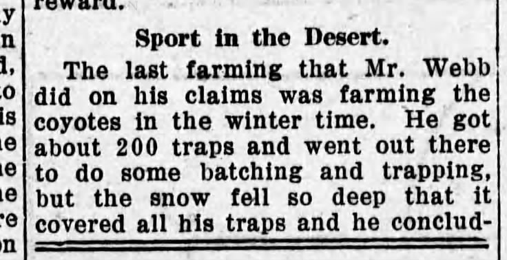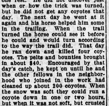 Ed Webb, a farmer-stockman in the desert area south of Taber and north of Springfield, took to trapping coyotes in the winter before finding it easier to run down the animals astride a horse. He and his fellow riders harvested 200 coyotes in 1922 with this method.