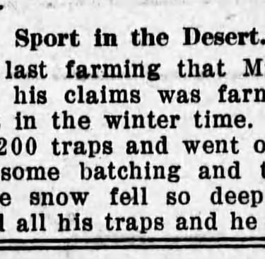The bounty continued into the twenties, with some Taberites supplementing their meager dry farm earnings by trapping. A. T. Frazier killed 53 coyotes and 6 lynx, collecting nearly $150 in bounty payment from the Sheriff's office, which paid out for 599 coyotes in 1922, in addition to bounties on 59 wildcats, 10 lynx and two wolves.