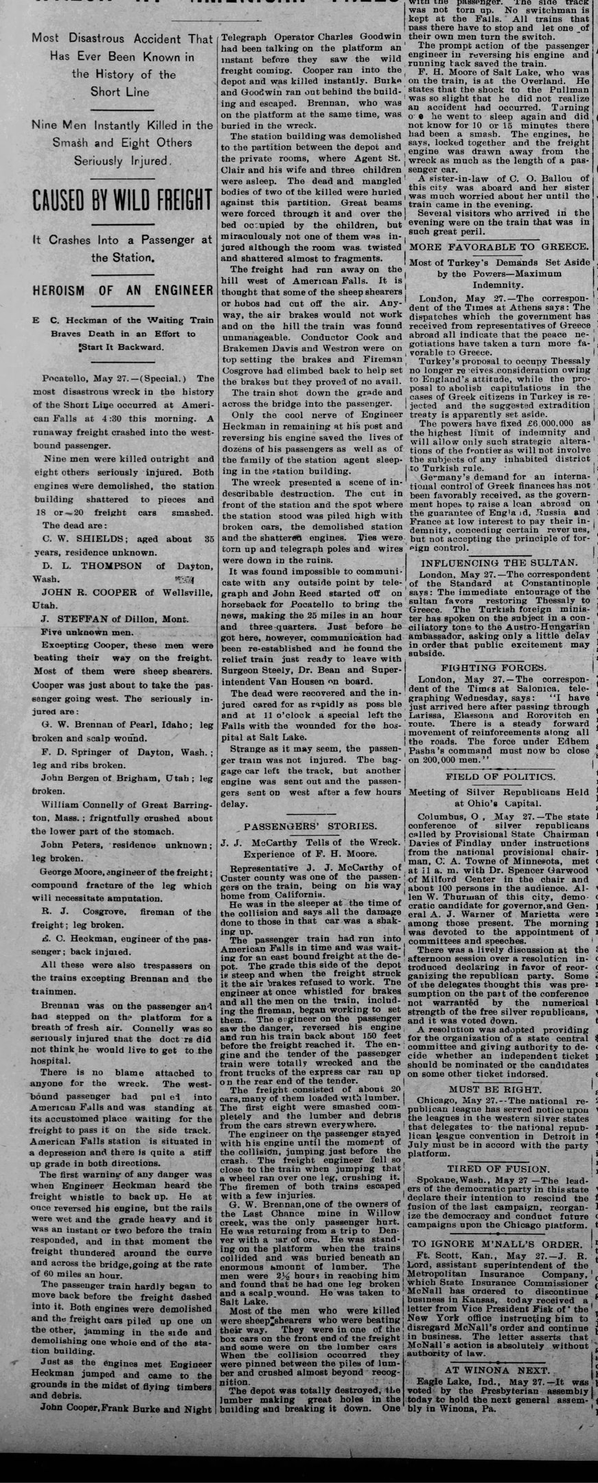 The worst train wreck in Oregon Short Line's existence occurred in 1897 at American Falls, when the air brakes (a relatively new invention) failed on a westbound freight train. The engineer of the westward passenger train, which was stationary and waiting for the freighter to be switched to a siding so it could continue on, recognized the approaching calamity (the freighter's speed, the brakeman atop the cars trying to set the hand brakes, the engineer's whistle clued him in) and attempted to back up. But the switching area sat in a dip and the tracks were wet due to the proximity to the falls, so the train wouldn't move. Nonetheless, the action prevented dozens from getting killed, as when the freighter struck the passenger unit it yielded rather than presenting a fixed target.