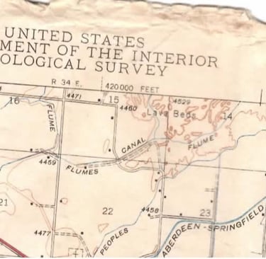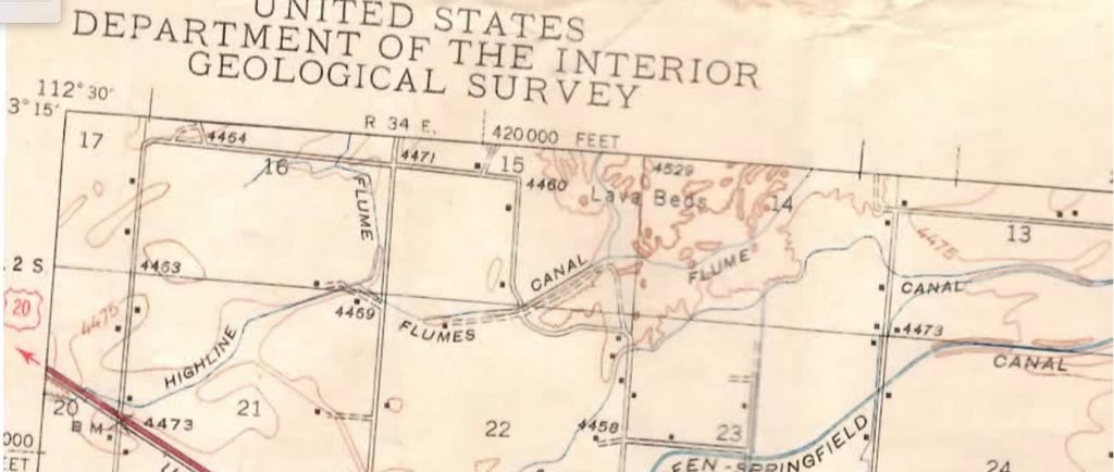 Above is a 1943 USGS map which shows the location of part of the West Side Canal flumes through the lavas northwest of Moreland. Compare to the recent map below for comparison.